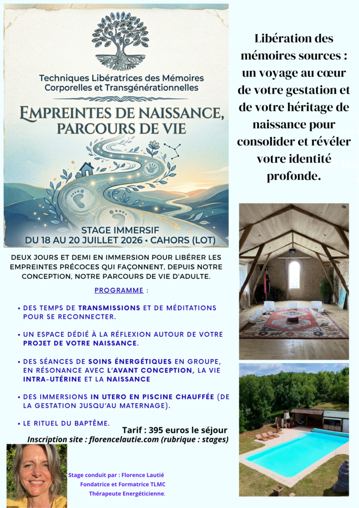 Je vous propose un accompagnement vers la libération des mémoires fœtales et de naissance, au cœur d’un site privilégié dans le Lot (46), lors d’un stage immersif de deux jours et demi.